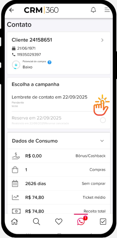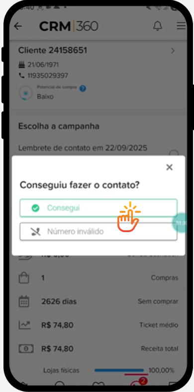 Após concluir o envio, retorne ao app CRM360 e clique em "Consegui", irá contabilizar alguns segundos e você será direcionado ao próximo cliente (caso tenha mais contatos pendentes no motivo escolhido).