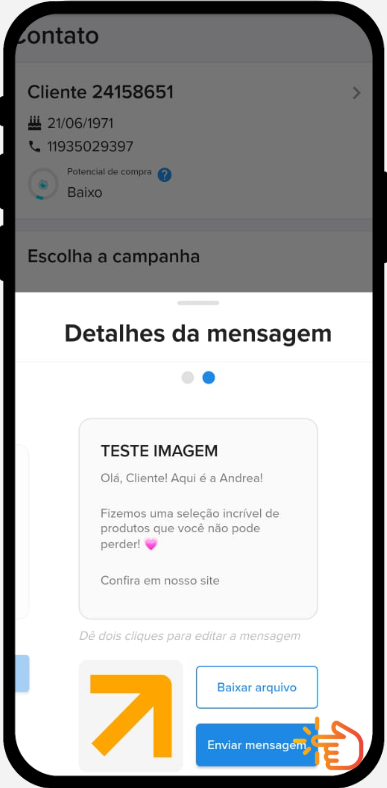 Você será direcionado ao número do cliente no WhatsApp, para realizar o envio. Se a mensagem tiver um arquivo, é nesse momento que você vai buscá-lo em seu dispositivo para incluir junto.