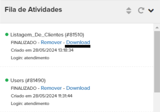 O relatório será adicionado a “Lista de Atividades”, exibido no canto inferior direito da tela. Quando estiver pronto para baixar, será exibido a opção de “Download”.